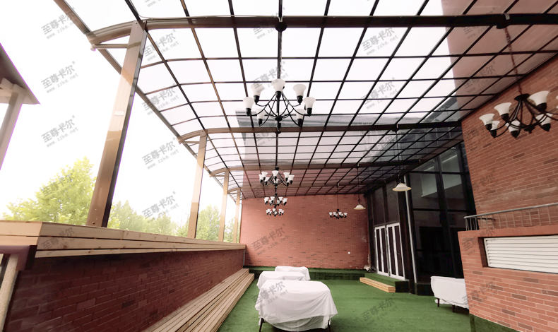 頂部用的是2.0mm聚碳酸酯板材,透光性能好(透光率88%)在陽光下曝曬不會產生黃變、霉化、透光不佳。表面有防紫外線的共擠層(uv涂成),可防止太陽紫外線引起的樹脂疲勞變黃。表面共擠層具有化學吸收紫外線并轉化為可見光。